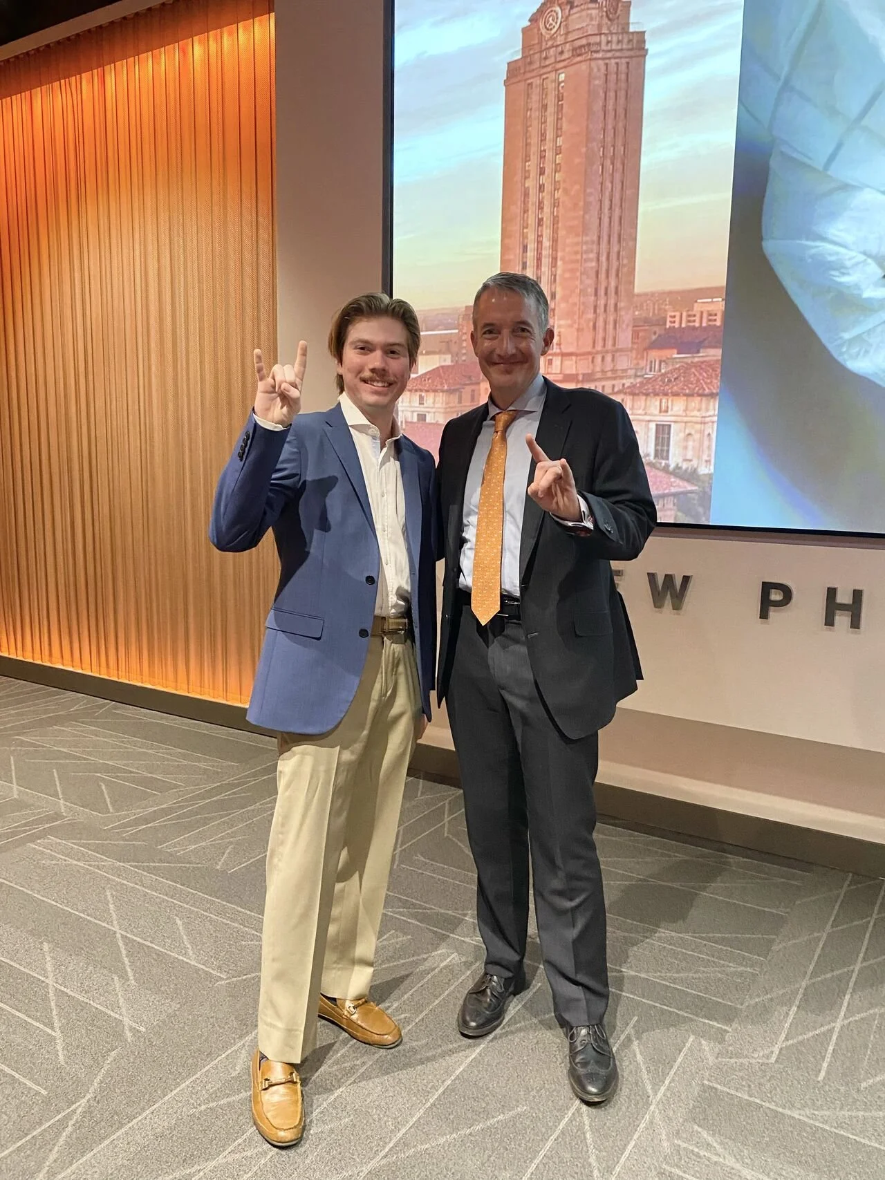He arrived at the University of Texas at Austin already carrying 38 college credits, and a $20,000 scholarship from GVTC Communications for his service to the community. He majored in International Relations & Government, became President of Delta Sigma Phi, and was awarded the Order of the Sphinx, the fraternity’s highest honor.